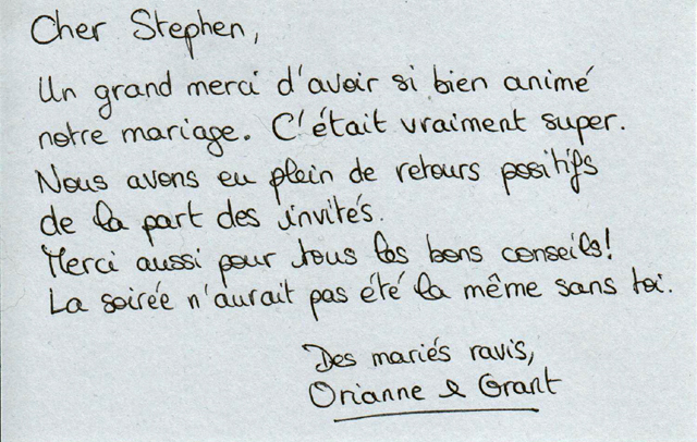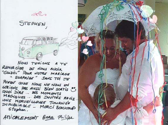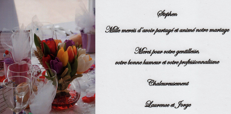 DJ, Animateur et guitariste, Stephen créera une atmosphère autour de votre repas en accompagnant les événements de la soirée: Entrée des mariés, discours, interludes, arrivée du gâteau. Suivant vos souhaits: Guitare, chansons, jeux, surprises, gestion des différentes interventions de vos convives. Préparation préalable et expérience.