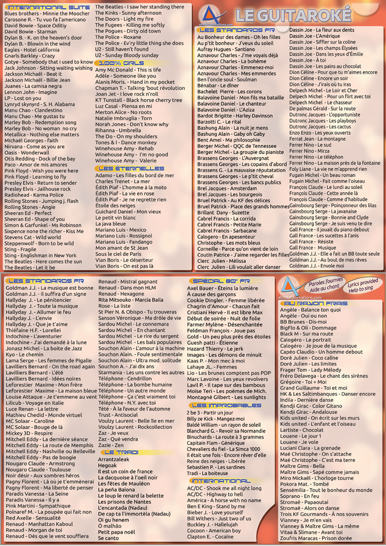 Cousin du karaoké, le Guitaroké amène son originalité par la dimension de la musique live. Seuls ou en groupe, les candidats interprètent les chansons de toujours et les tubes du moment. Les paroles sous les yeux pour de belles rencontres accompagnées d'une guitare.